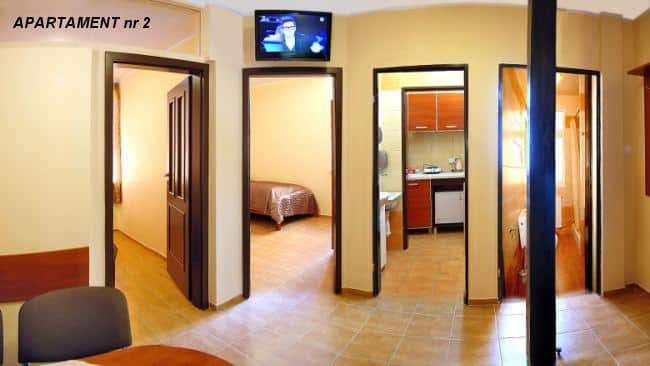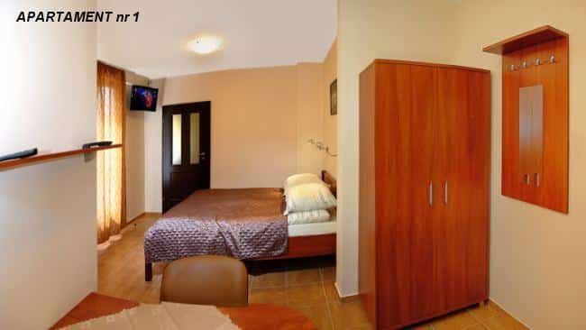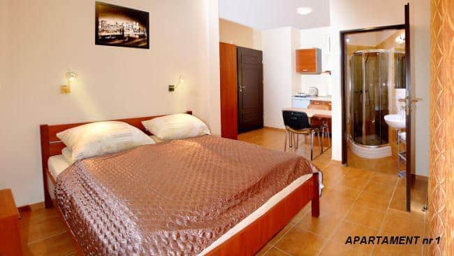 Każdy apartament jest wyposażony w kompletną kuchnię, w której można samodzielnie przygotowywać posiłki. Do dyspozycji Gości są: lodówka, garnki, talerze oraz płyta palnikowa. W pokojach znajdziecie również telewizor, radio i świeże ręczniki, co zapewnia komfortowy pobyt.