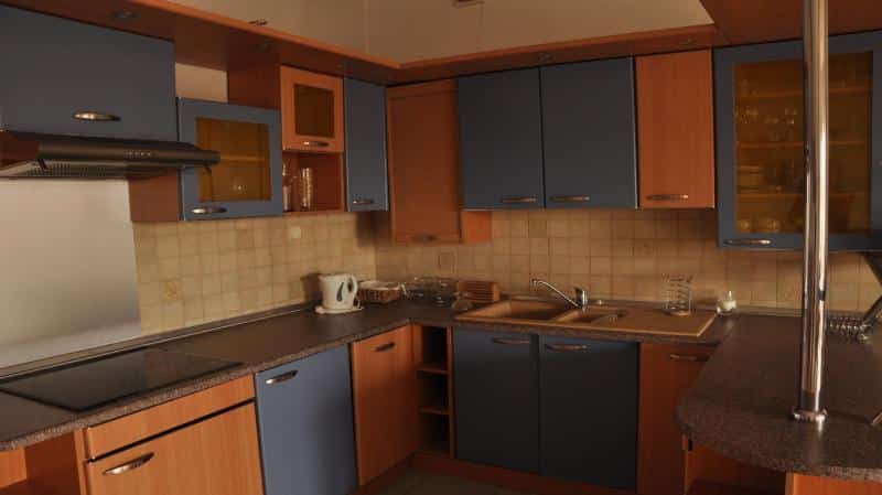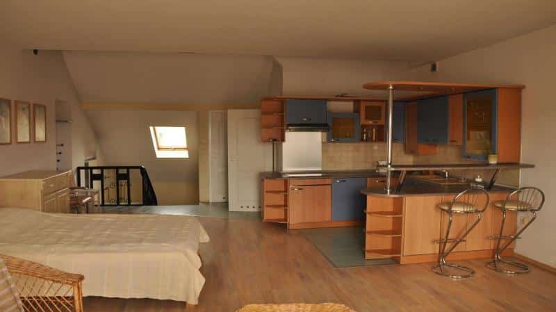 – **Apartament z wnęką dla 4 osób** z łóżkiem dwuosobowym i dwoma łóżkami jednoosobowymi, kuchnią i łazienką.