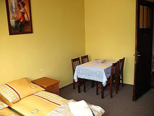– **Apartament trzyosobowy**: Z możliwością zakwaterowania czterech osób, składa się z pokoju i werandy. W pokoju znajduje się łazienka, biurko, telewizor i dwa tapczany. Weranda oferuje wersalkę, stół, krzesła i aneks kuchenny z lodówką i płytą ceramiczną. Apartament ma osobne wejście. Cena za dobę wynosi 150 zł.