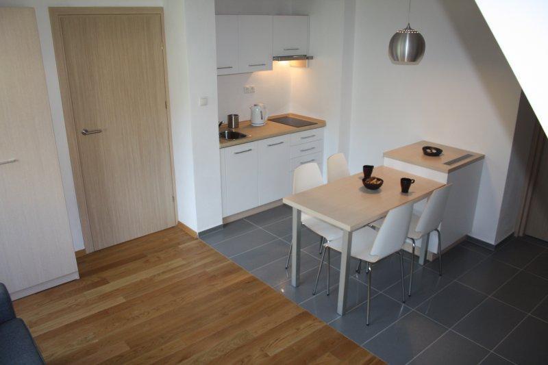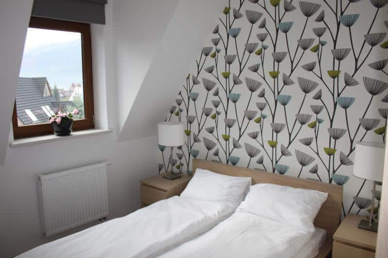 – Wyposażenie: sypialnia z łóżkiem małżeńskim, salon z rozkładaną sofą, aneks kuchenny z kuchenką indukcyjną, lodówką, zmywarką