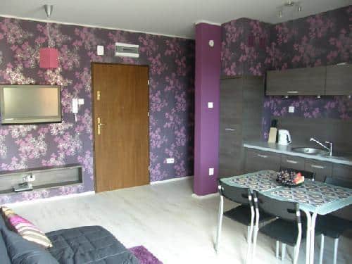 – **Apartament FIOLETOWY**: Powierzchnia 40 m², dwa pokoje, dwa balkony. Również pomieści pięć osób.