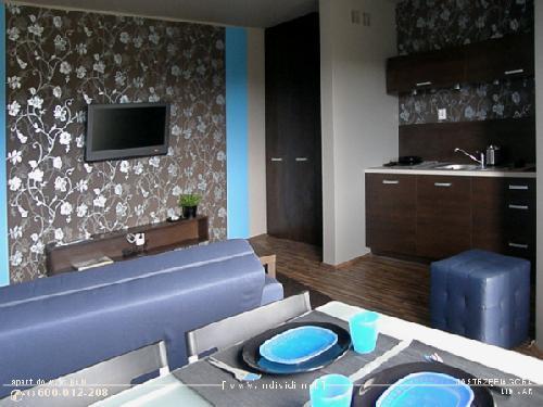 – **Apartament NIEBIESKI**: Powierzchnia 40 m², dwa pokoje, dwa balkony. Idealny dla pięciu osób.
