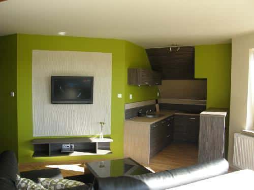 – **Apartament ZIELONY**: Dwukondygnacyjny, o powierzchni 90 m², z trzema pokojami i tarasem. Przystosowany dla ośmiu gości.