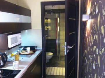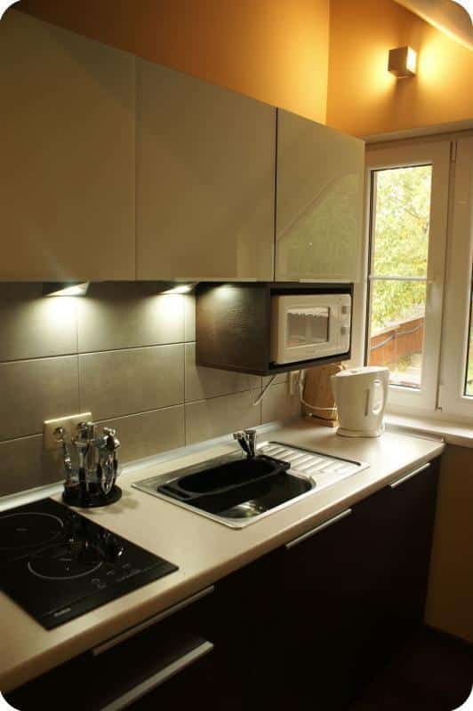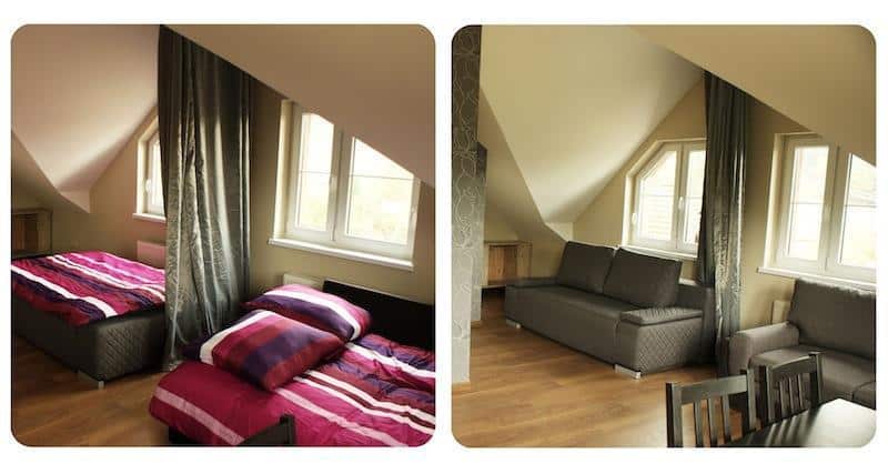 W budynku znajdują się cztery nowo oddane apartamenty z możliwością zakwaterowania max. 15 osób. Wszystkie apartamenty mają widok na jezioro i są urządzone w wysokim standardzie. Są nowocześnie i funkcjonalnie urządzone, zapewniając komfortowy pobyt. Każdy apartament posiada kompletnie wyposażoną kuchnię, w której znajduje się lodówka, mikrofalówka i czajnik. W pokoju znajduje się telewizor, duże wygodne rozkładane 2-osobowe sofy, szafy typu “komandor”, żelazko i deska do prasowania. Łazienka jest wyposażona w prysznic, ręczniki i suszarkę do włosów.
