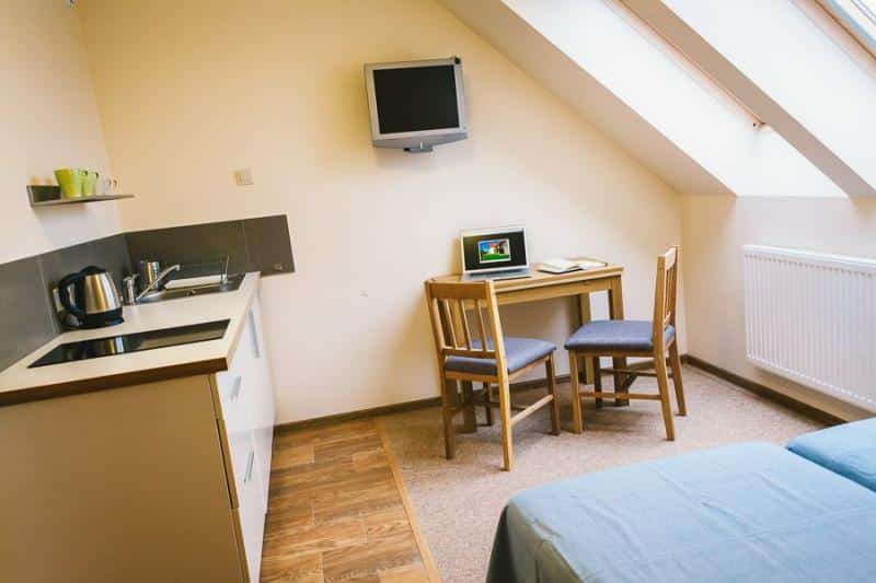 – Dwupokojowe apartamenty z własną kuchnią i łazienką.