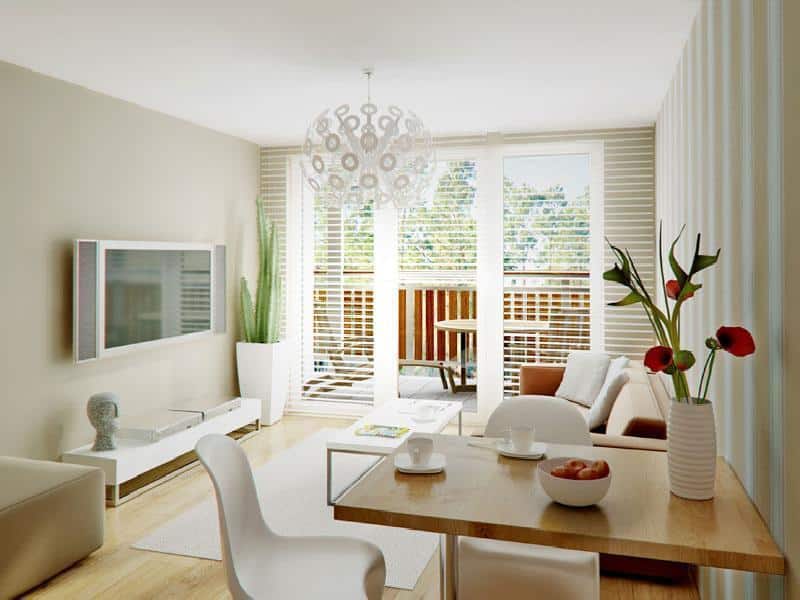– Komfortowe meble: wygodna kanapa, fotel, stolik kawowy, stół z krzesłami, przestronna szafa