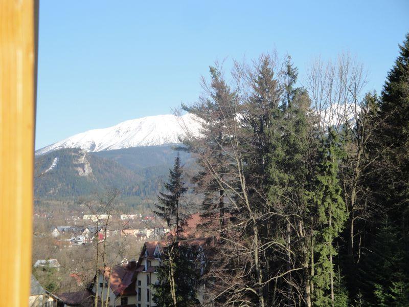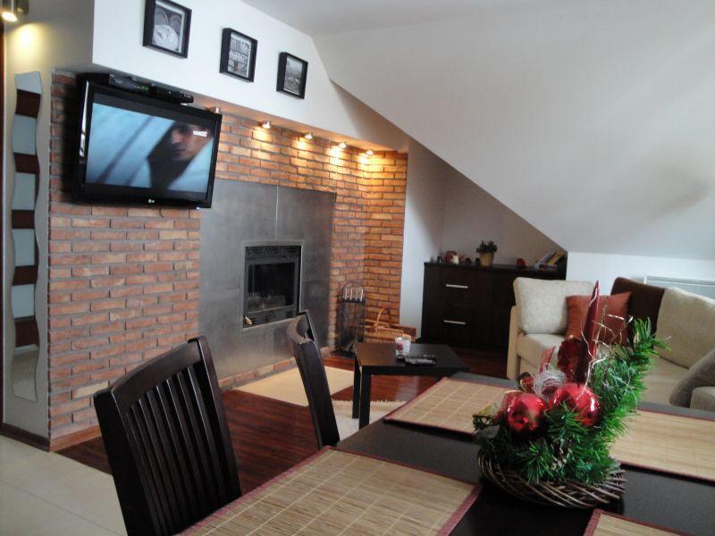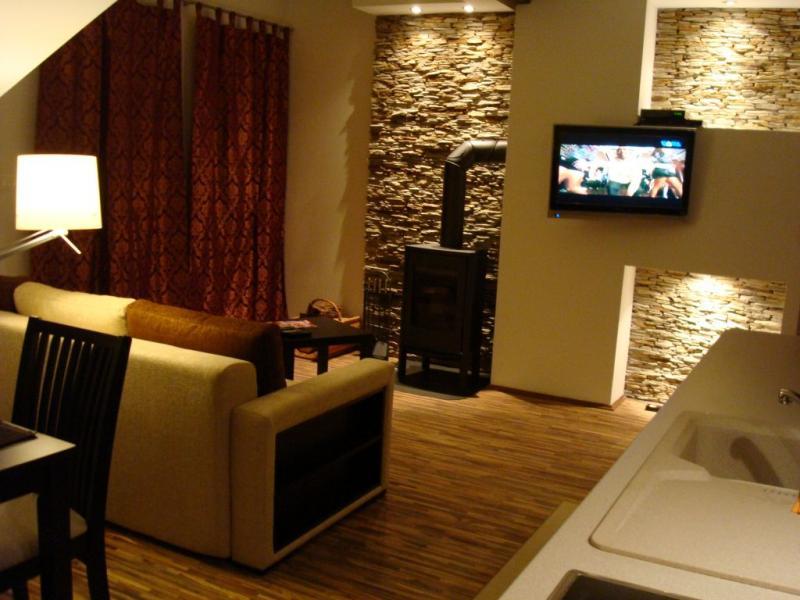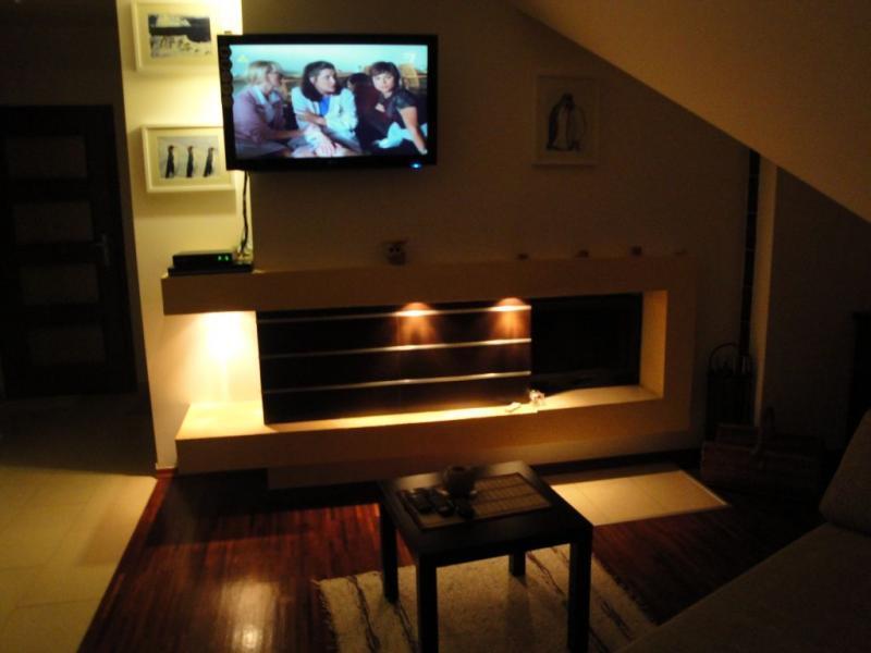 – Salon z kominkiem, rozkładaną sofą, komodą, stolikiem do kawy, regulowaną lampą podłogową oraz dostępem do telewizji satelitarnej i WiFi. Z salonu można wyjść na balkon z widokiem na Zakopane i Gubałówkę.