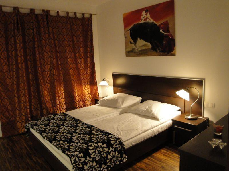– Sypialnię z kominkiem, dużym podwójnym łóżkiem, szafkami nocnymi, komodą, niską szafą, miniwieżą, telewizorem i WiFi. Z sypialni można wyjść na drugi balkon.
