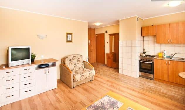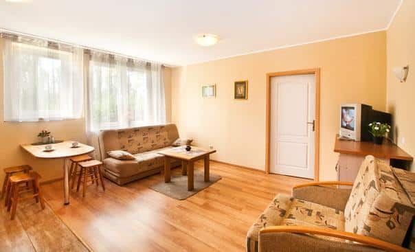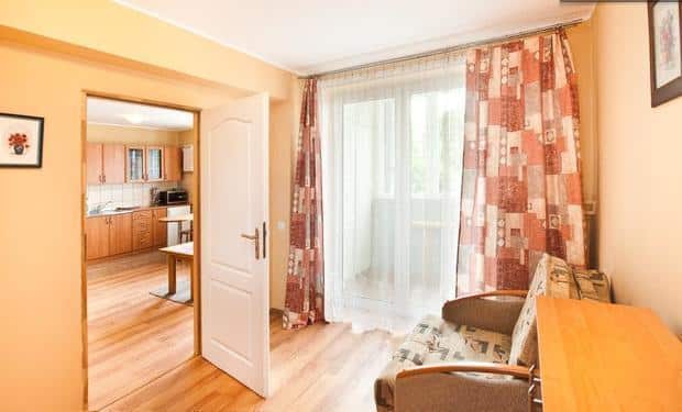 – Wyposażenie: balkon, kuchnia, łazienka, dwie dwuosobowe wersalki, jednoosobowa sofa