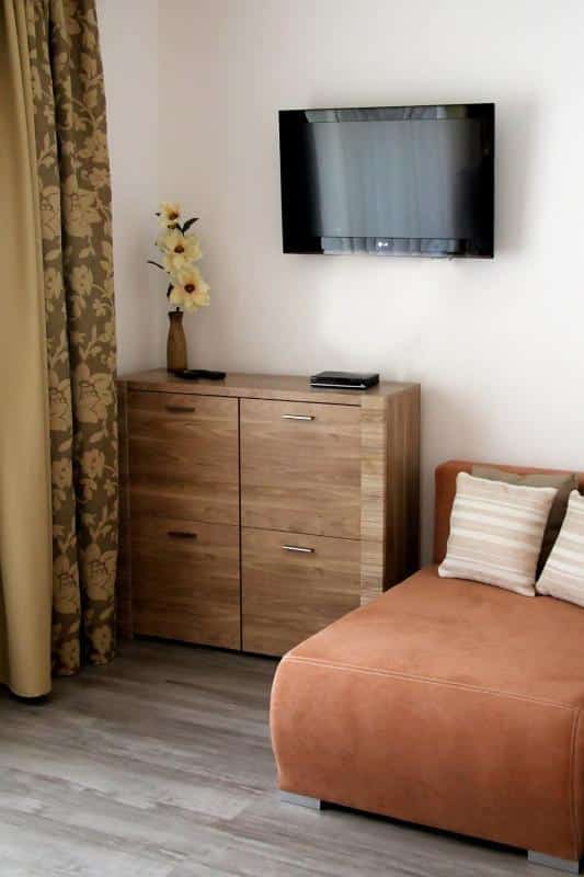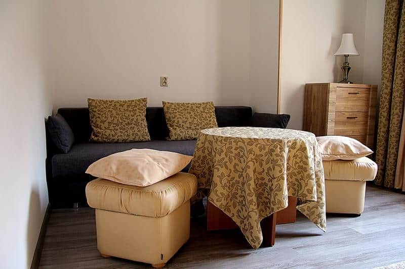 Apartament “Klasyczny” to apartament z niezależnym wejściem z zewnątrz, zajmujący parter budynku. Apartament utrzymany jest w klasycznym klimacie wystroju. Składa się z 2 pokoi, każdy z niezależną łazienką, korytarza oraz aneksu kuchennego. Pokój kremowy może pomieścić maksymalnie 3 osoby i posiada balkon, telewizor LCD, radio oraz bezpłatny dostęp do WiFi. Pokój kwiatowy jest przeznaczony dla maksymalnie 2 osób i posiada bezpłatny dostęp do WiFi. Apartament jest przystosowany do zamieszkania dla jednej rodziny lub grupy znajomych.