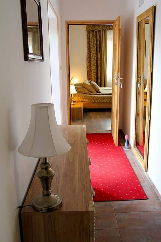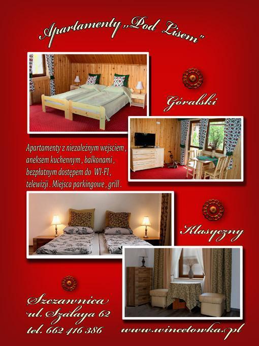Apartament “Góralski” to apartament z niezależnym wejściem z zewnątrz, zajmujący całe I piętro budynku. Apartament utrzymany jest w góralskim klimacie wystroju. Składa się z 2 pokoi, łazienki, korytarza z niezależnym wyjściem na balkon, klatki schodowej z mini holem oraz aneksu kuchennego. Pokój zielony jest przeznaczony dla maksymalnie 2 osób, posiada 2 balkony, telewizor LCD, radio oraz bezpłatny dostęp do WiFi. Pokój czerwony może pomieścić maksymalnie 3 osoby i posiada balkon, radio oraz bezpłatny dostęp do WiFi. Apartament jest przystosowany do zamieszkania dla jednej rodziny lub grupy znajomych.