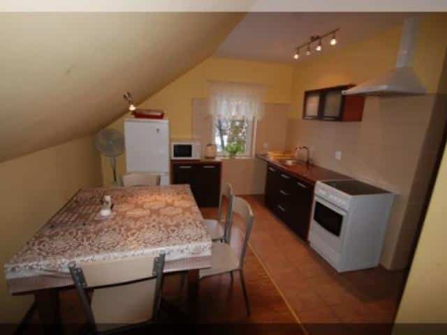 – W pełni wyposażoną kuchnię z aneksem śniadaniowo-kolacyjnym (lodówka, zamrażarka, piec z płytą ceramiczną, kuchenka mikrofalowa i inne),
