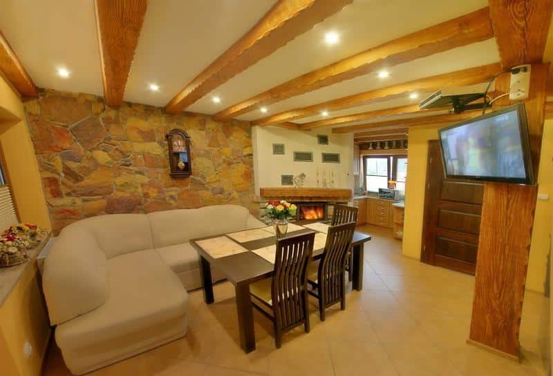 Każdy z siedmiu apartamentów został zaprojektowany z myślą o wygodzie naszych gości. Na parterze znajdziesz przestronny salon z kominkiem, gdzie możesz odpocząć przy cieple ognia. W salonie znajduje się również wygodna kanapa narożna, która w razie potrzeby może służyć jako dodatkowe miejsce do spania dla dwóch osób. W pełni wyposażona kuchnia pozwoli Ci przygotować ulubione posiłki, a łazienka z prysznicem i pralką zapewni pełen komfort. Dodatkowo, zadaszony taras to doskonałe miejsce na poranną kawę lub wieczorne rozmowy.