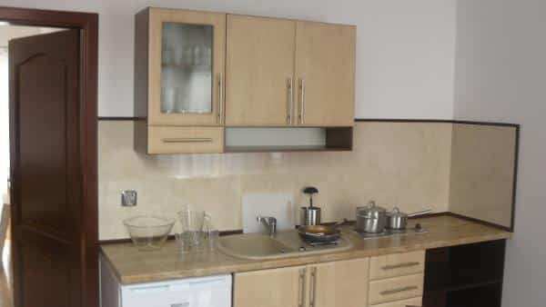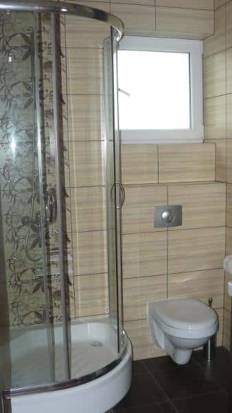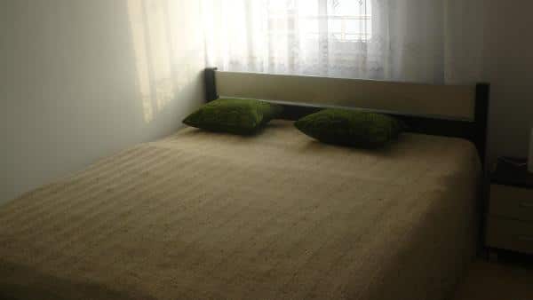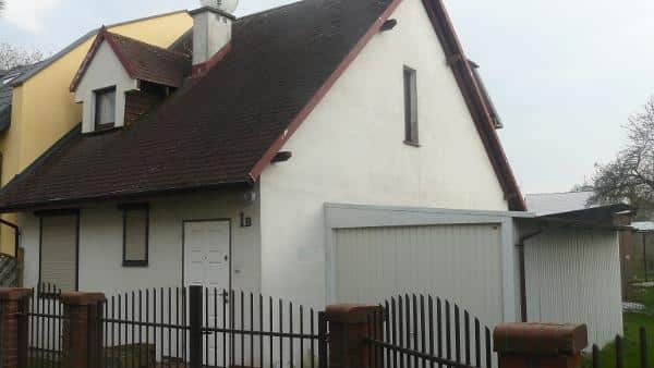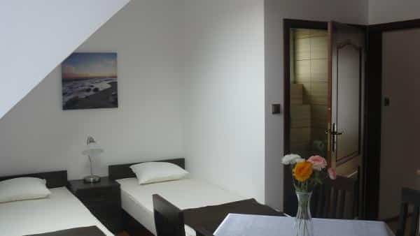 Oferujemy także komfortowy domek, który pomieści 6 osób. Na parterze znajduje się przestronny pokój dzienny z kuchnią, a na piętrze dwie sypialnie. Domek jest w pełni wyposażony w sprzęt RTV i AGD, w tym telewizor z cyfrową telewizją, kuchenkę elektryczną, lodówkę, mikrofalówkę, wannę z prysznicem, pralkę oraz żelazko z deską do prasowania. Obok domku znajduje się garaż na jeden samochód. Cały teren jest ogrodzony i wyposażony w plac zabaw dla dzieci z huśtawką i piaskownicą, a także miejsce na rodzinnego grilla.