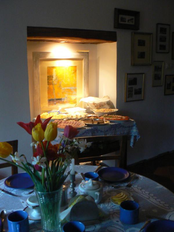 W jadalni można ogrzać się przy piecu i skosztować domowych specjałów, w tym świeżo wypiekanego chleba.