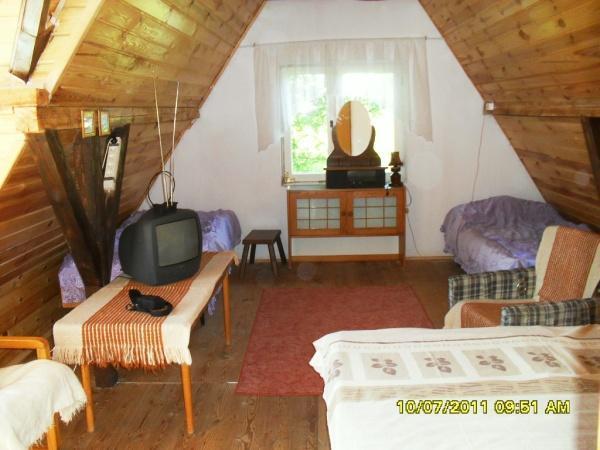 – Poddasze z długim 9-metrowym pomieszczeniem dla 4 osób i oknem z widokiem na jezioro Białe