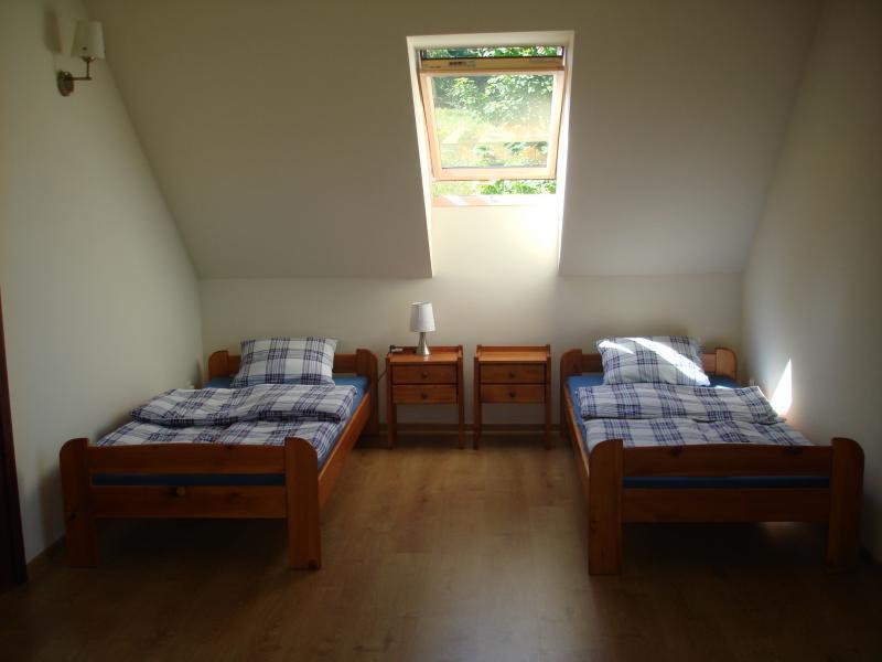 Na piętrze do dyspozycji są dwa pokoje, każdy dla dwóch osób.