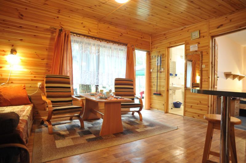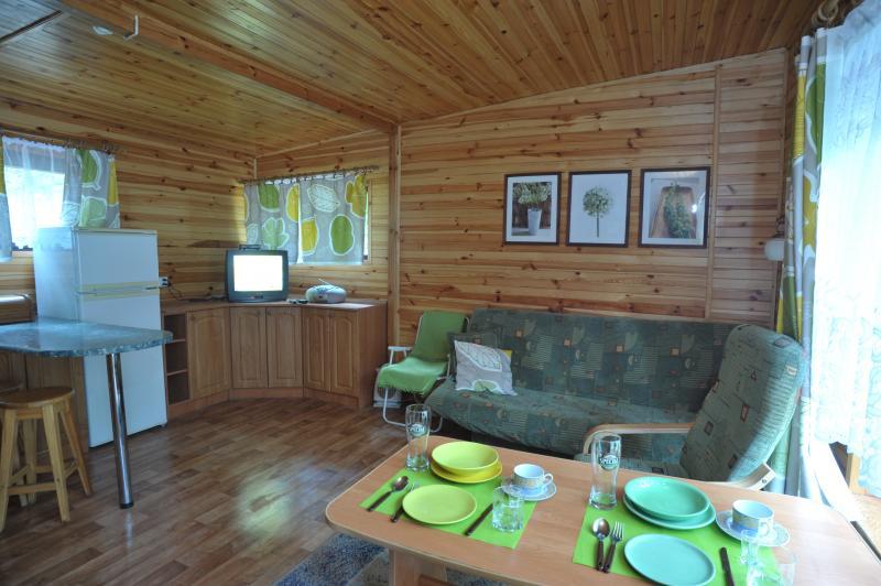– Salon z rozkładaną kanapą, fotelami, aneksem kuchennym (naczynia, garnki, kuchenka gazowa, lodówko-zamrażarka), telewizor, radiomagnetofon.