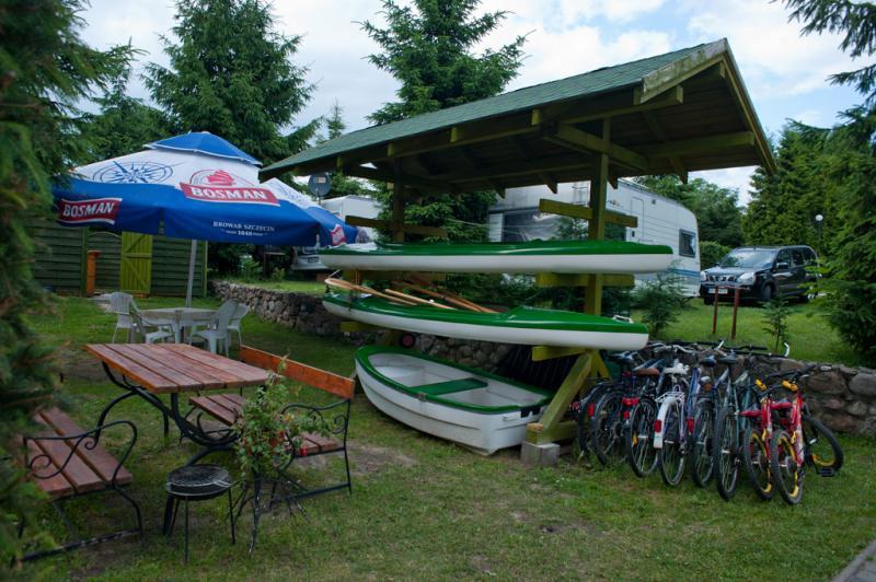 Dodatkowe udogodnienia obejmują kuchnię turystyczną, saunę, ruską banię, plac zabaw, boisko do siatkówki, stół do tenisa oraz świetlicę. Na miejscu można wypożyczyć rowery, łódki i kajaki, a także skorzystać z darmowego internetu. W sezonie letnim działa kawiarenka “Na skarpie”.