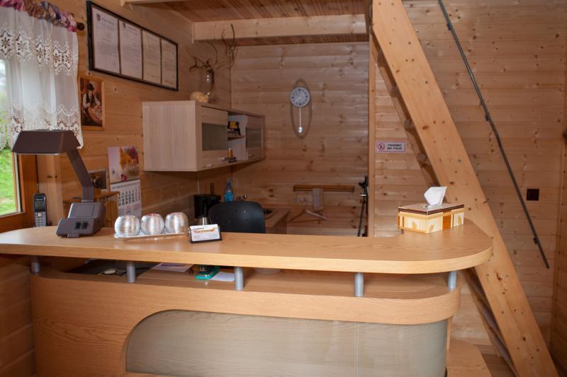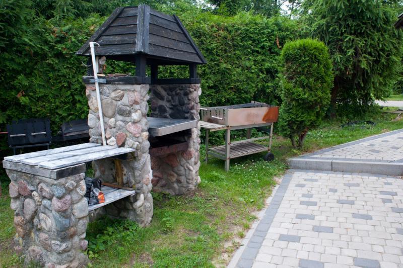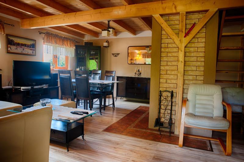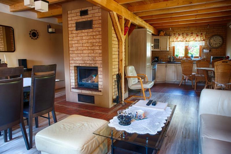– **Dom wakacyjny**: Drewniany dom z zadaszonym tarasem, posiadający salon, kuchnię, dwie łazienki i dwie sypialnie. Na wyposażeniu m.in. zmywarka, kominek i telewizor LCD.