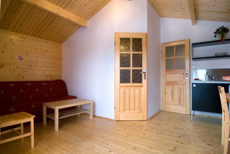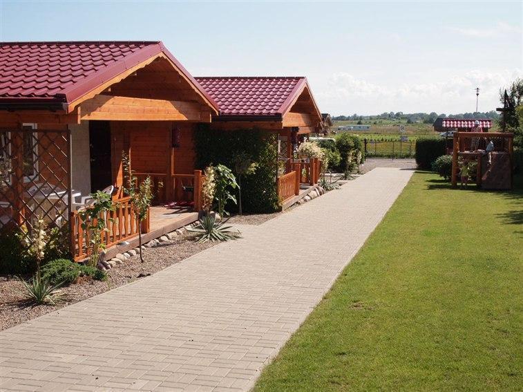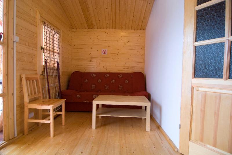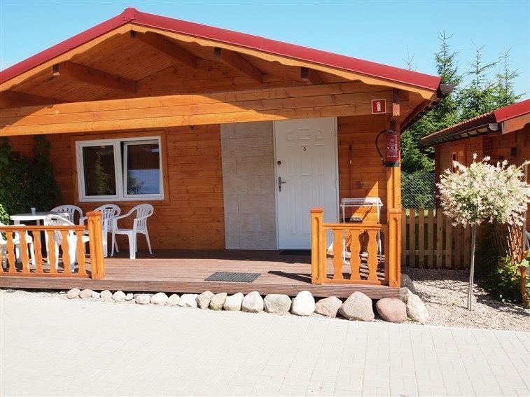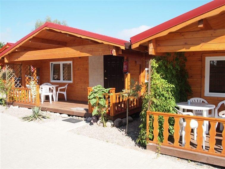 The living room has a sofa bed for 2 people, a TV, a table, and a wardrobe. The bathroom has a toilet, sink, and a shower cabin. The cabins have a terrace and garden furniture. The fenced area is closed (only our guests have keys to the resort).