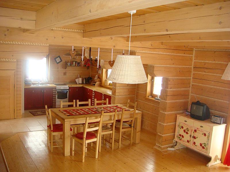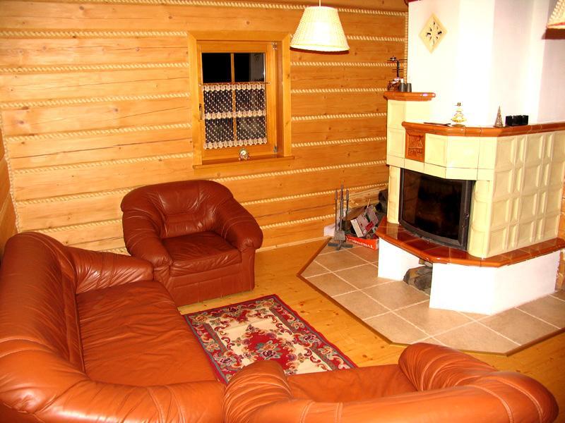 – Salon: z kaflowym kominkiem, skórzaną sofą z funkcją spania, dwoma fotelami oraz ręcznie malowanym kredensem. Z salonu jest wyjście na obszerny taras.