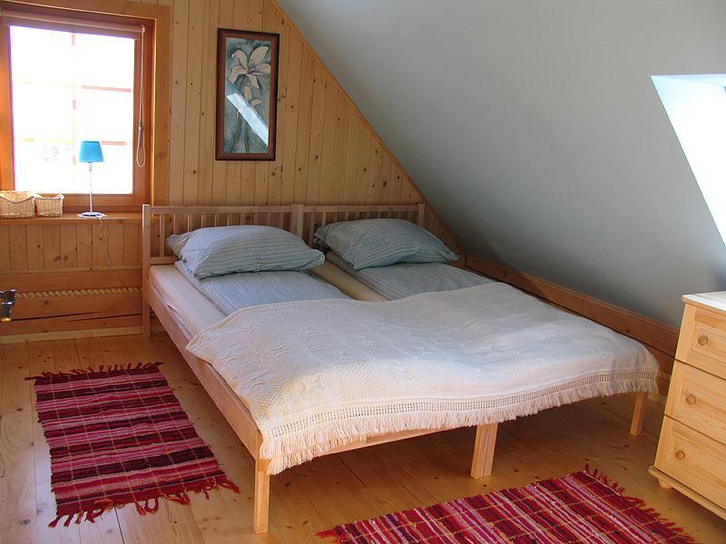 – Pokój niebieski: z dwoma połączonymi drewnianymi łóżkami (2×90 cm), komodą i wieszakiem na ubrania.