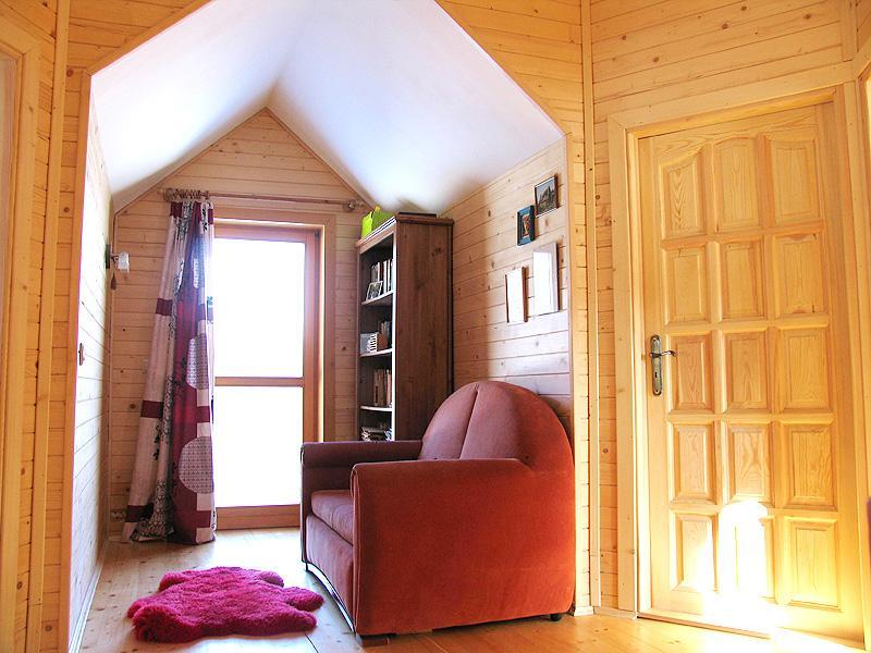 – Salonik-hall (Kapliczka): z wyjściem na balkon, rozkładaną sofą i regałem z książkami.