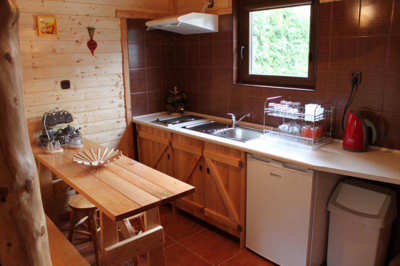 Zapraszamy do naszych urokliwych chatek, które stanowią idealne miejsce na relaksujący wypoczynek. W każdej z nich znajdziesz przytulny salon z kominkiem, gdzie można odpocząć i rozkoszować się ciepłem płomieni. Aneks kuchenny jest w pełni wyposażony, co pozwala na swobodne przygotowywanie posiłków, dając poczucie domowej atmosfery. Komfortowa łazienka z kabiną natryskową zapewni wygodę podczas codziennych zabiegów higienicznych.