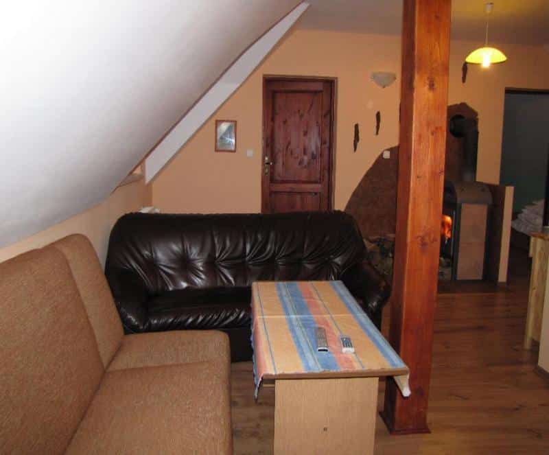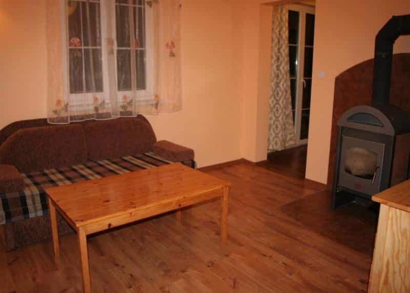 – Salon z przytulnym piecykiem typu “koza” (drewno w cenie),