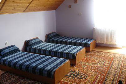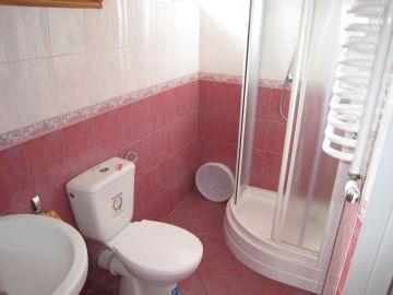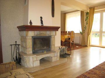 Dom o powierzchni użytkowej 180 m² oferuje komfortowe warunki do wypoczynku. Na parterze znajdziesz w pełni wyposażoną kuchnię, aneks jadalny, przytulny salon z kominkiem i wyjściem na taras, łazienkę oraz przestronny przedpokój. Dodatkowo, na tym poziomie znajduje się dwuosobowa sypialnia. Na piętrze czekają na Ciebie dwa pokoje czteroosobowe, jeden trzyosobowy i jeden dwuosobowy, każdy z własną łazienką, co zapewnia pełną prywatność.