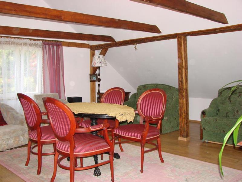 – Parteru, na którym znajduje się przestronny salon z kominkiem i telewizorem, dwie sypialnie dwuosobowe, oddzielna kuchnia ze spiżarnią oraz łazienka z prysznicem i pralką.