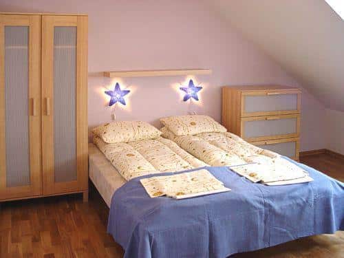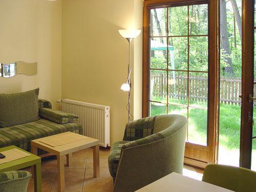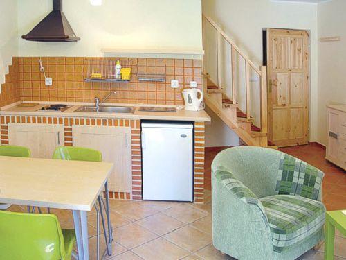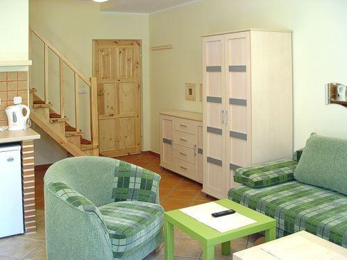 Każdy apartament składa się z dwóch poziomów – parteru i piętra – oraz posiada własny aneks kuchenny. Wszystkie aneksy są wyposażone we wszystko, co niezbędne do przygotowania i spożycia posiłków. Przed każdym apartamentem znajduje się miejsce do grillowania, wyposażone w meble ogrodowe i grill. Dodatkowo, udostępniamy bezpłatnie łóżeczka dla niemowląt, wanienki do kąpieli i krzesełka do karmienia (po wcześniejszym uzgodnieniu).
