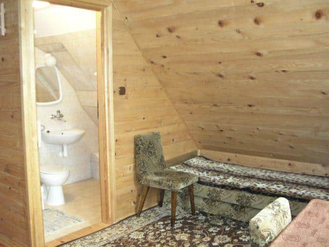 Zapraszamy do naszego urokliwego, dwukondygnacyjnego domku z drewna, który zapewnia niezapomnianą atmosferę i przyjemny zapach natury. Na parterze znajdują się dwa komfortowe pokoje, każdy z własną łazienką, oferujące od 2 do 6 miejsc noclegowych. Dodatkowo, do dyspozycji gości jest w pełni wyposażona kuchnia oraz przedpokój. Na piętrze czekają kolejne dwa pokoje z łazienkami, które pomieszczą od 2 do 5 osób. Łącznie domek oferuje 14 łóżek, w tym 5 podwójnych, co pozwala na zakwaterowanie grupy do 19 osób.