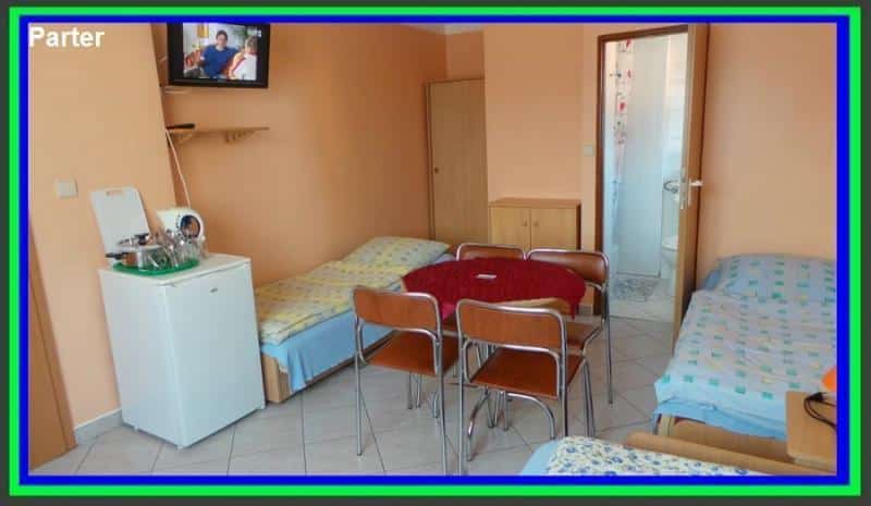Na terenie naszej posesji zapewniamy również parking dla samochodów. Wszystkie nasze pokoje i domki są wyposażone w lodówkę, telewizor, internet oraz łazienkę z prysznicem i WC.