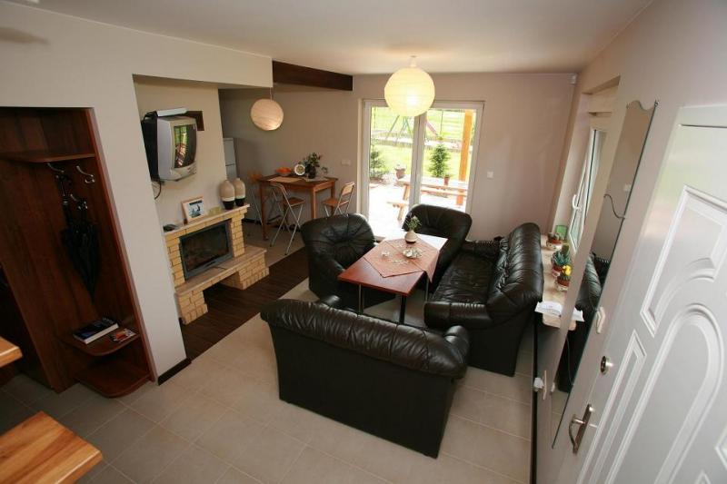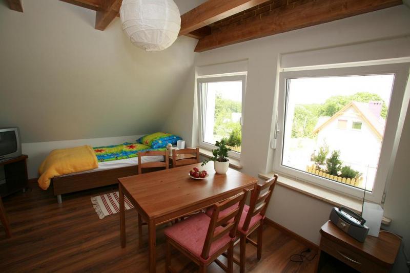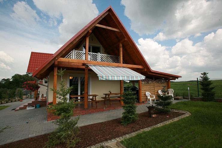 Na parterze znajduje się przestronny salon z kominkiem, połączony z w pełni wyposażoną kuchnią i jadalnią, z wyjściem na taras. Dodatkowo, na tym poziomie są dwa pokoje oraz łazienka z prysznicem. Drewniane schody prowadzą na poddasze, gdzie mieści się przytulna sypialnia, druga łazienka z prysznicem oraz pokój dzienny z balkonem.