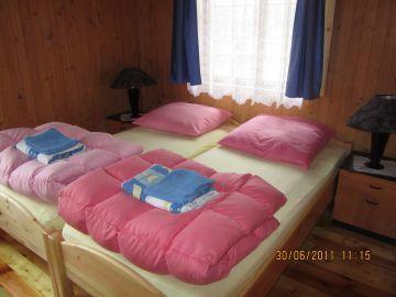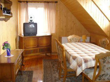 Na parterze znajduje się w pełni wyposażona kuchnia, przestronny salon z kominkiem, który ogrzewa cały dom, oraz wyjście na taras o powierzchni 80 m². Dodatkowo do dyspozycji są dwie dwuosobowe sypialnie, łazienka oraz duży przedpokój. Na piętrze znajdą Państwo kolejną kuchnię, dwie dwuosobowe sypialnie, z czego jedna z balkonem, oraz jedną trzyosobową sypialnię również z balkonem. Dopełnieniem piętra jest duży pokój jadalny oraz łazienka.