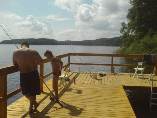 Dom znajduje się na ogrodzonej działce w osadzie domów letniskowych, zaledwie 100 metrów od jeziora. Na parterze znajduje się przestronny salon z kominkiem, telewizorem i rozkładaną wersalką, w pełni wyposażona kuchnia oraz łazienka z prysznicem. Do dyspozycji gości jest także garaż i dodatkowe miejsce postojowe na terenie posesji, a także zadaszony taras z meblami ogrodowymi i grillem.