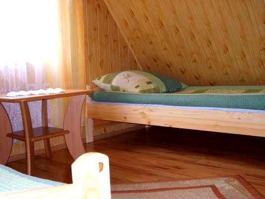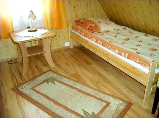 Domek pomieści do 6 osób i oferuje komfortowy wypoczynek na dwóch poziomach oraz tarasie. Na piętrze znajdują się dwa przytulne pokoje dwuosobowe z pojedynczymi łóżkami, komodami i lampkami nocnymi. Na parterze mieści się kolejny pokój z dużym łóżkiem małżeńskim, łazienka z prysznicem oraz w pełni wyposażona kuchnia.