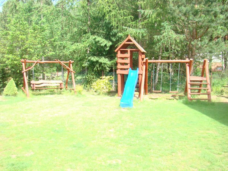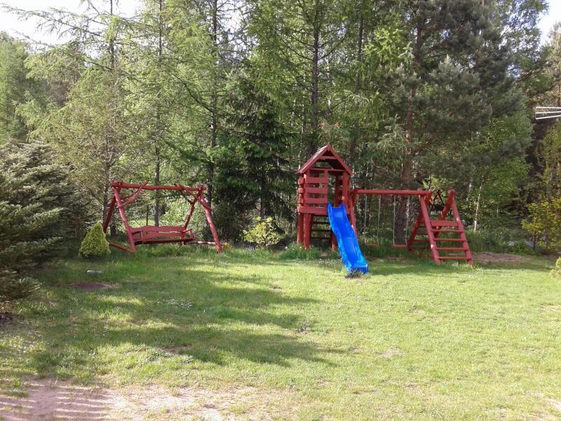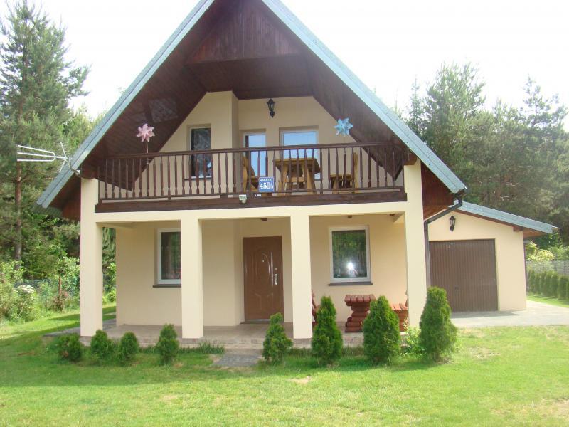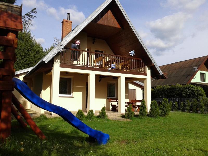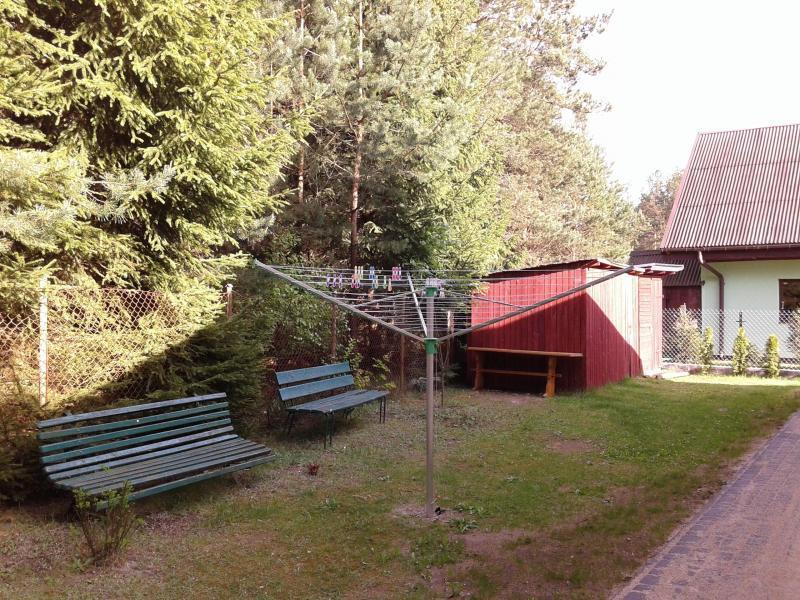 Na zewnątrz czekają na Ciebie dwa zadaszone tarasy, które są doskonałym miejscem na grillowanie. Dzieci mogą bawić się w piaskownicy i na huśtawce. Działka o powierzchni 650 m2 jest ogrodzona i posiada garaż na jeden samochód. Domek położony jest zaledwie 50 metrów od pięknego lasu i 200 metrów od jeziora Marksoby, gdzie znajduje się kąpielisko z pomostem oraz drewniana łódka wędkarska dostępna dla naszych gości.