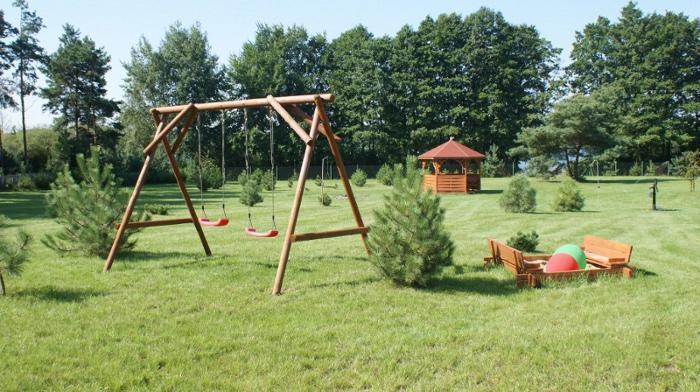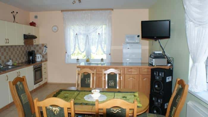 Oferujemy komfortowo wyposażony dom o powierzchni 180m na obszernej działce, gwarantującej Państwu relaks i wypoczynek z dala od zgiełku i hałasu. Dom przeznaczony dla 10-12 osób, 2 łazienki, 5 sypialni. Na parterze, salon z pełni wyposażoną kuchnią i kominkiem, sprzęt AGD i RTV, w tym DVD, zestaw do karaoke, cyfra+ (pakiet HD), internet wifi. Na piętrze kącik wypoczynkowy i telewizor.