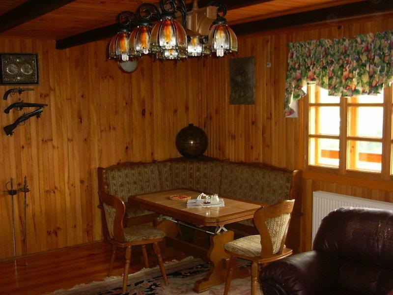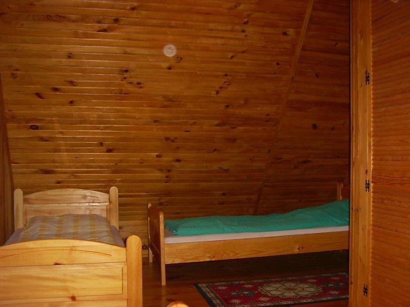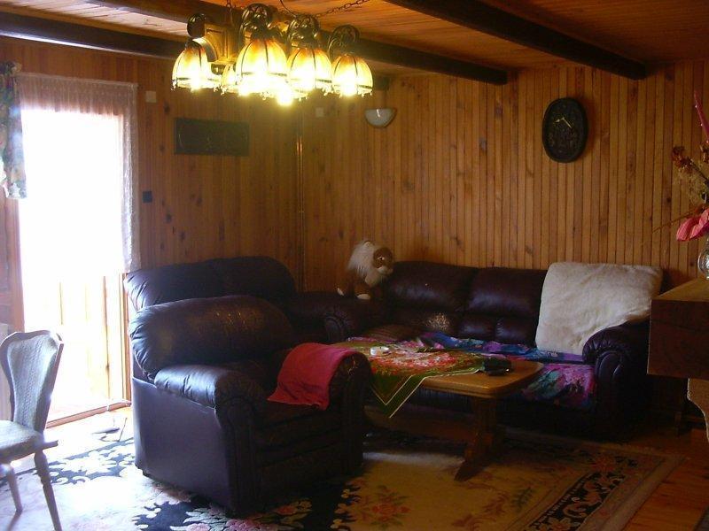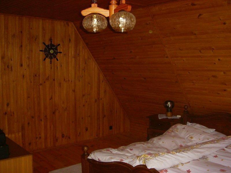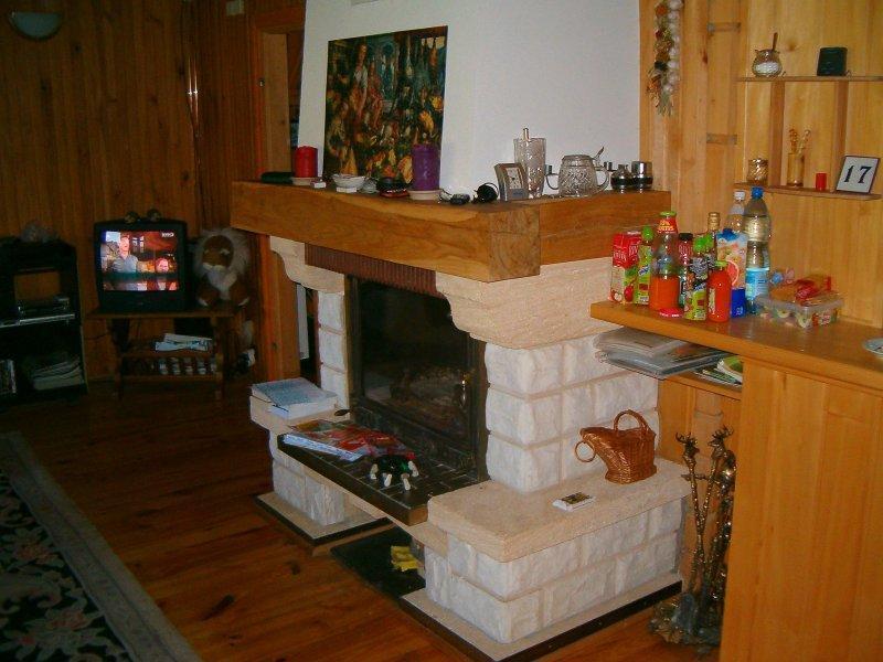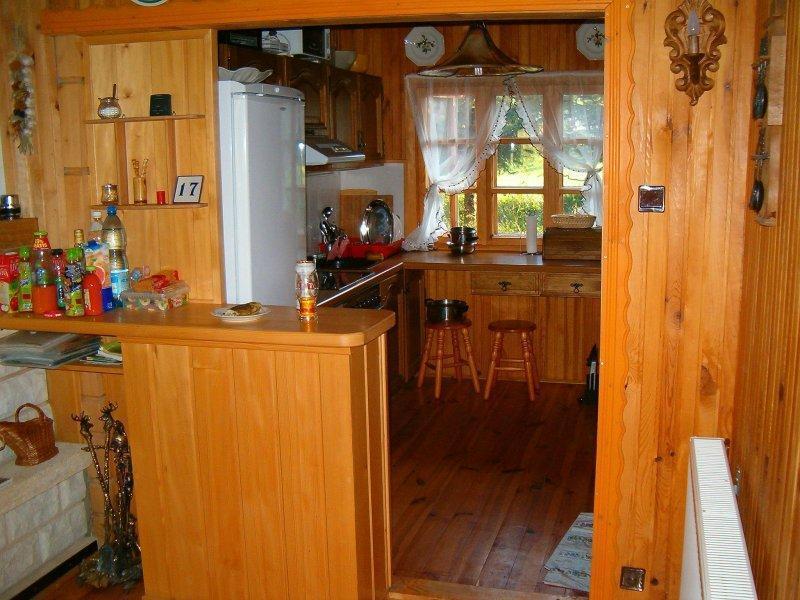 Na pierwszym piętrze, w części drewnianej, czeka na Ciebie przestronny hall, przytulny salon z kominkiem, telewizją satelitarną, DVD, Internetem i radiem. Kuchnia jest w pełni wyposażona, oferując lodówkę, piec, zmywarkę do naczyń i kuchenkę mikrofalową. Znajdziesz tu również łazienkę z kabiną prysznicową i pralką.