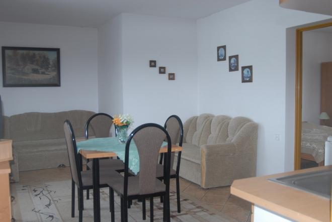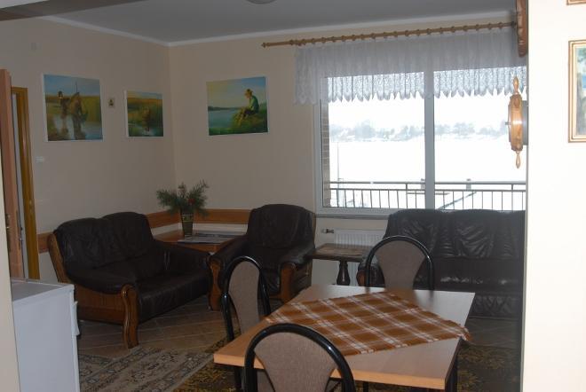 – Przestronny salon z w pełni wyposażoną kuchnią (zmywarka, lodówka), mogący pomieścić do 30 osób.