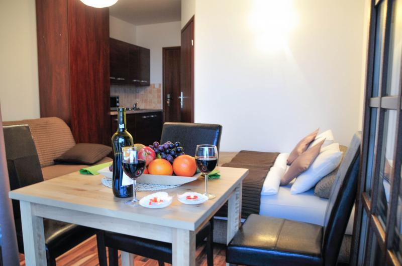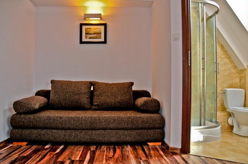4. **Luksusowy apartament 2-pokojowy** – dla tych, którzy marzą o wyjątkowym pobycie. Apartament oferuje panoramiczny widok na morze, przestronną łazienkę, jadalnię oraz pełne wyposażenie.