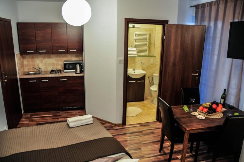 Wszystkie nasze pokoje posiadają łazienkę, telewizor oraz dostęp do internetu wi-fi. Dla wygody gości oferujemy wspólny aneks kuchenny, a w pokojach komfort i apartamencie – indywidualny aneks kuchenny.