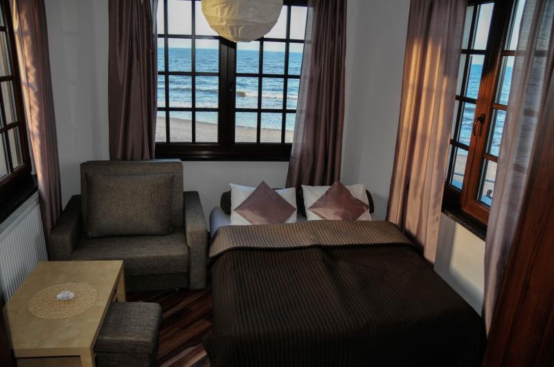 3. **Pokoje komfort** – dla wymagających gości, wykończone w wysokim standardzie, z indywidualnym aneksem kuchennym i balkonem, a także z widokiem na morze.