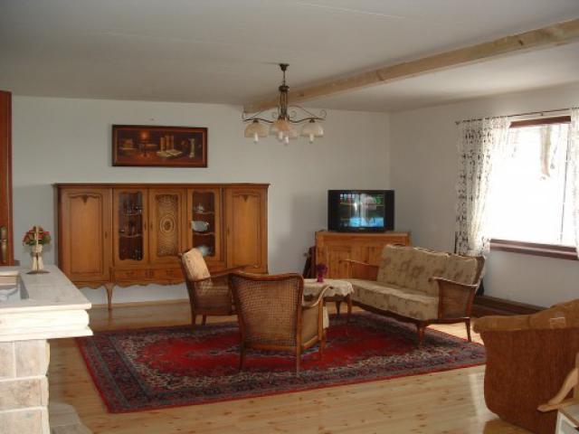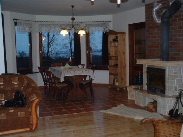 – Salon z kominkiem (powierzchnia ok. 50 m²) z rozkładanym zestawem wypoczynkowym