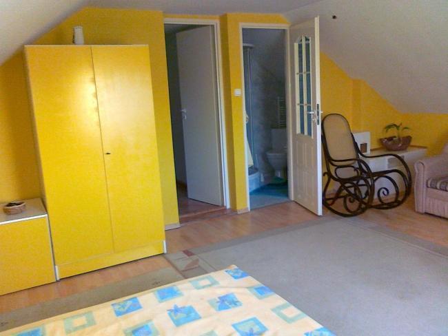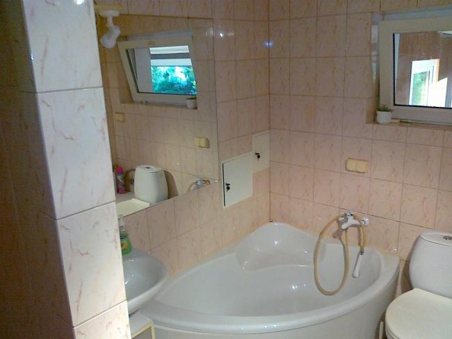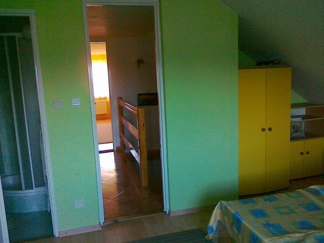 Oferujemy Państwu komfortową część domu z osobnym wejściem. Na parterze znajduje się kuchnia z panoramicznym widokiem na jezioro oraz przestronny salon z kominkiem, oba pomieszczenia mają wyjście na taras. Znajduje się tu również duża łazienka z narożną wanną i prysznicem. Na piętrze dostępne są dwa dwuosobowe pokoje z łazienkami oraz dodatkowa kanapa dla gości.