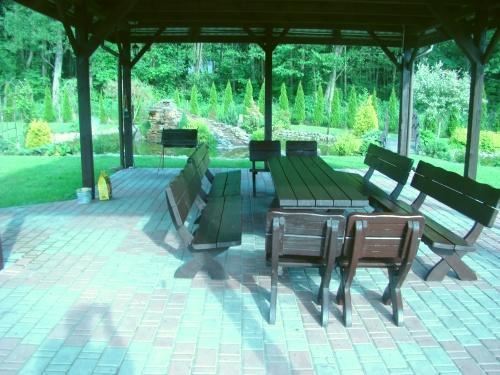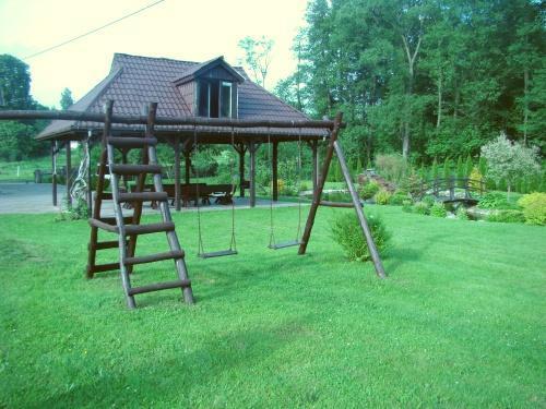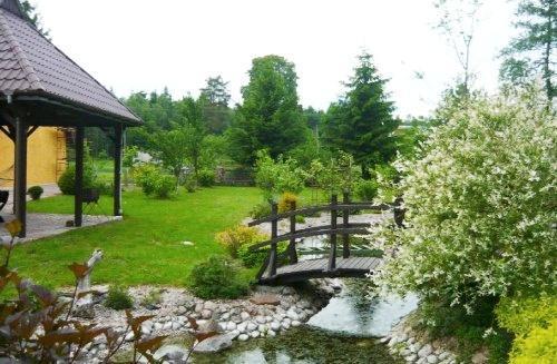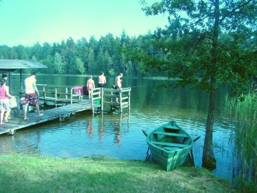 Nasz dom otacza ogrodzony teren o powierzchni około 0,5 ha, gdzie znajdziesz wiele atrakcji: wysepkę z fontanną, zadaszone miejsce na ognisko i grilla, boisko do siatkówki i koszykówki, plac zabaw dla dzieci oraz wiszącą ławkę pod 120-letnią lipą. Oferujemy także prywatny dostęp do jeziora z pomostem, idealnym miejscem do wędkowania i opalania. Łódka jest do dyspozycji gości w cenie pobytu.