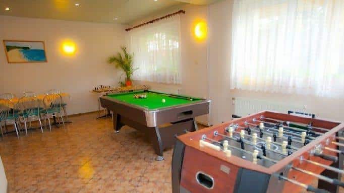 Dla Państwa wygody przygotowaliśmy także ogólnodostępny aneks kuchenny z pełnym wyposażeniem. Na terenie obiektu można aktywnie spędzić czas, korzystając z takich atrakcji jak tenis stołowy, cymbergaj, piłkarzyki, bilard oraz szachy. Dzieci z pewnością ucieszy pokój zabaw i mini plac zabaw.